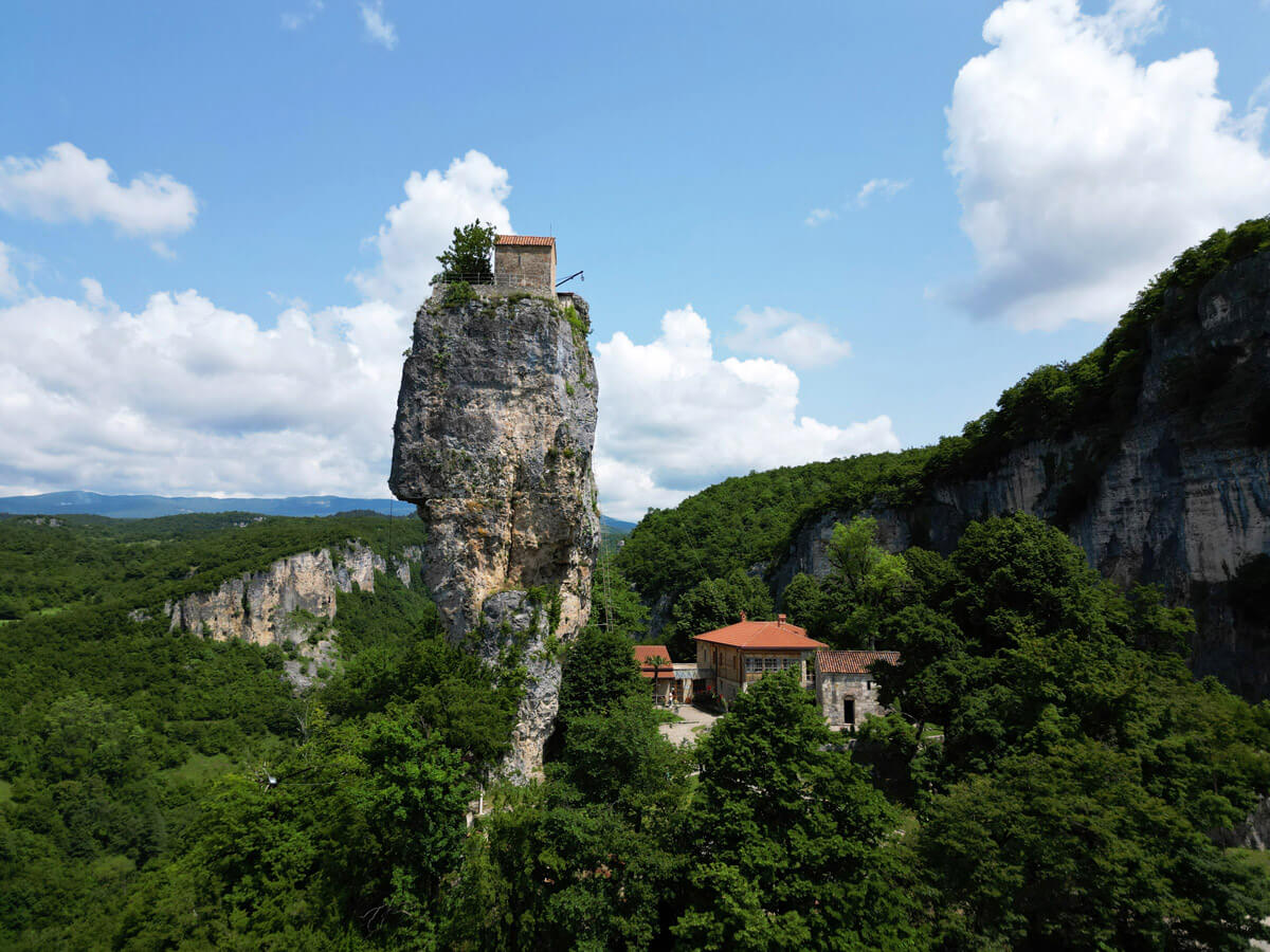 Am Weg nach Kutaissi empfiehlt sich noch der Abstecher zur Kazchi Säule. Diese Felssäule mit einem Kloster obenauf ist wirklich einzigartig (in Georgien, in Griechenland gibt es sowas tatsächlich auch) und wir fanden es einen richtig coolen kurzen Stopp. Ich habe hier mit der Drohne einige Aufnahmen gemacht, aber auch ohne Drohne kann man die Säule sehr klar erkennen.