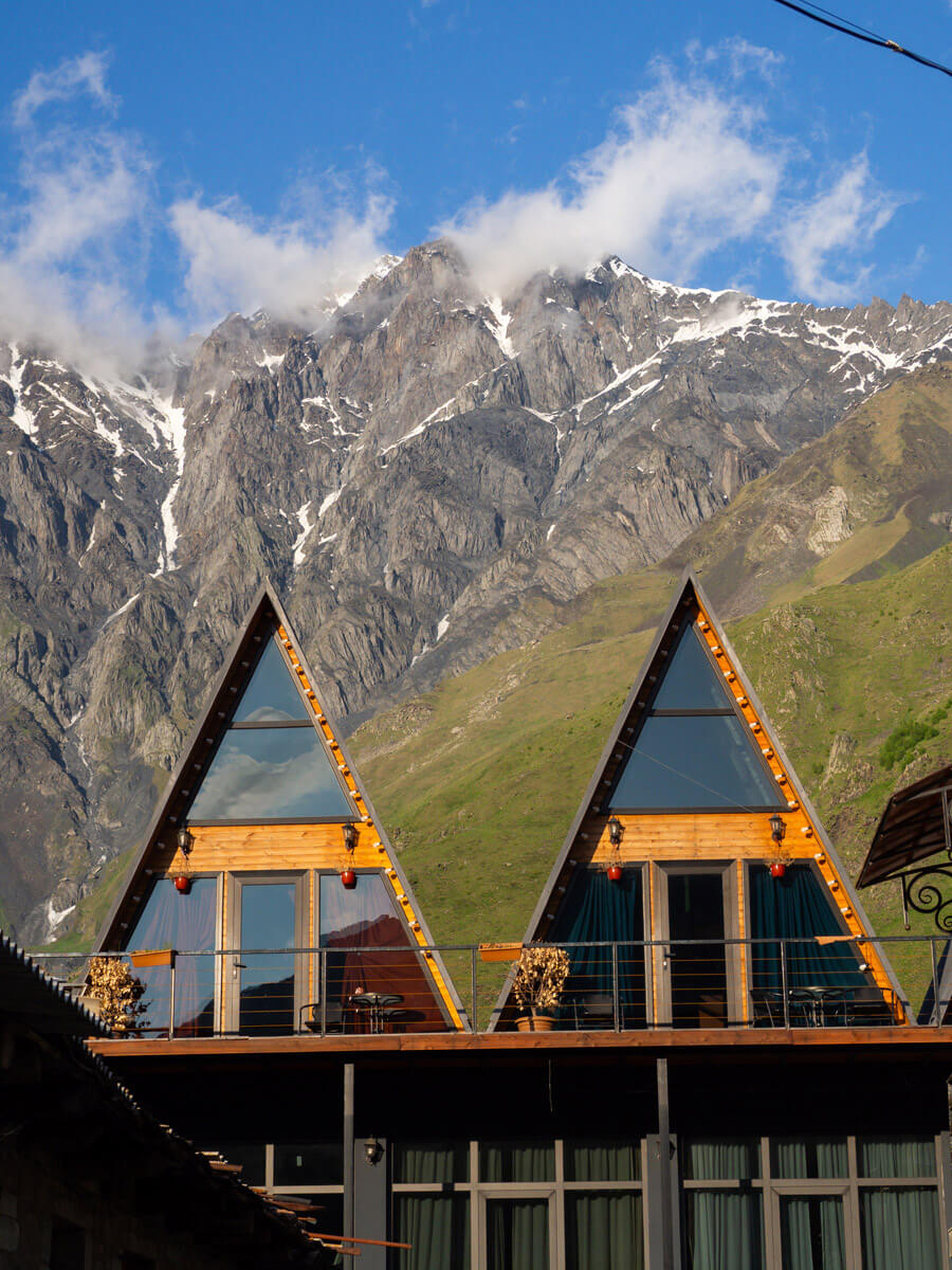 Unterkunftstipp: In Stepanzminda gibt es viele kleine Hütten, die man mieten kann. Wir haben uns für die Unterkunft Pyramid Kazbegi entschieden, da diese aber voll war, wurden wir verlegt in die Via Kazbegi und haben es absolut geliebt! Aber auch bei Pyramid Kazbegi sind wir vorbei gekommen und fanden wir sehr schön von außen!