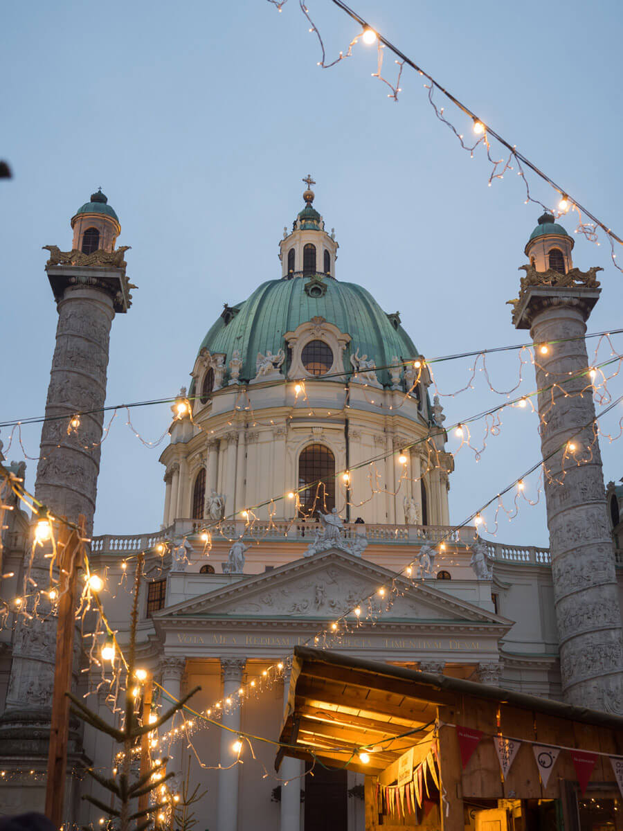 Die Karlskirche ist wohl eine der schönsten Kirchen in Wien. Prominent steht die barocke Kirche mit der großen Kuppel am Karlsplatz unweit vom Wiener Naschmarkt. Insbesondere im Winter zur Glühweinsaison versprüht der Adventmarkt dort eine besondere Atmosphäre.