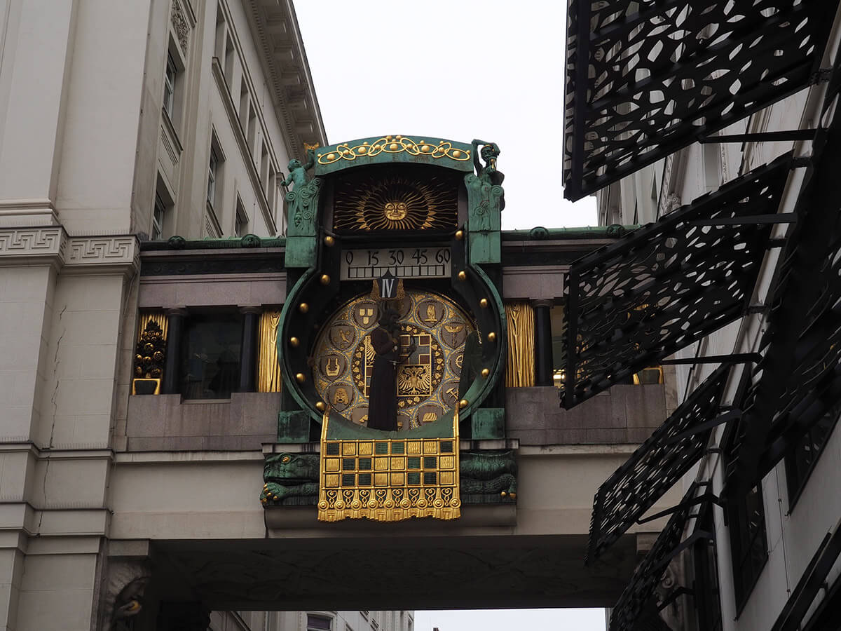 Diese große Spieluhr am hohen Markt zeigt zwölf historische Österreicher. Um 12 Uhr Mittags laufen diese im Schnelldurchlauf von 15 Minuten mit musikalischer Umrandung.